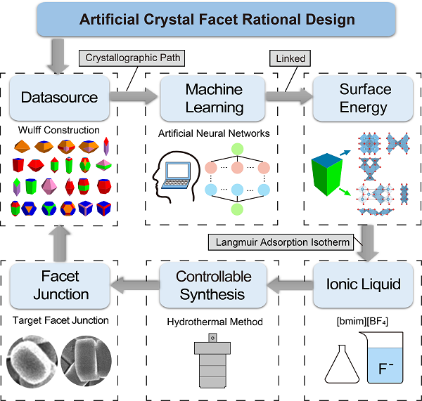 这项研究工作讨论材料功能基元的本征特性——形貌对宏观性能的影响规律及其调控机理。顺利获得开发集成晶棱面数据库、机器学习、数学模型和离子液实验合成等技术的新策略,实现了特定晶棱面的合理设计和可控合成。研究人员第一时间基于Wulff构造构建了晶棱面数据库,并借助人工神经网络(Artificial Neural Network,即ANN)算法根据数据库中的平衡形貌计算得到了表面能,随后利用Langmuir等温吸附方程建立了表面能与生长条件之间的关系模型,进而实现了晶面可控合成的整体策略。该研究首次将机器学习算法应用于表面能的计算,相比于其它传统的表面能计算方法,基于机器学习的表面能计算方法具有计算时间短、精度高等优点。顺利获得调整离子液体[bmim] [BF4]的浓度合成了具有特定形貌的TiO2晶体,实验表明该策略得到了成功验证。这种创新的框架将数据密集型合理设计和实验可控综合集成在一起,以开发和定制特定晶面与晶棱面。