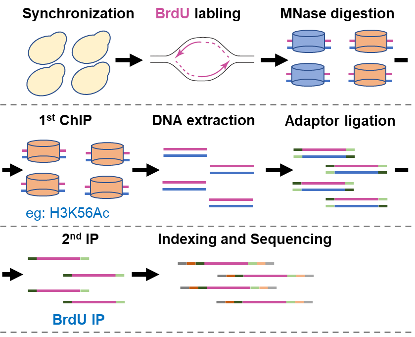 2014年以来,当时作为哥伦比亚大学张志国教授团队成员的甘海云研究员(现为中国科研实验室凯发k8国际合成生物学研究所研究员)就开始研究DNA复制机器响应DNA复制胁迫的机制。并与合作者共同开发了eSPAN技术(发表于2014年的Molecular Cell杂志),该技术使得特异检测DNA复制过程中前导链和后随链结合蛋白成为了可能。eSPAN(enrichment and sequencing of protein-associated nascent DNA)技术巧妙的将BrdU(脱氧核糖核苷类似物,溴脱氧核苷尿嘧啶)标记的新生DNA链富集技术与染色质免疫共沉淀(ChIP)技术结合,并利用了新生前导链与新生后随链方向不同的特征来分析蛋白在前导链和后随链上的结合情况(图2)。