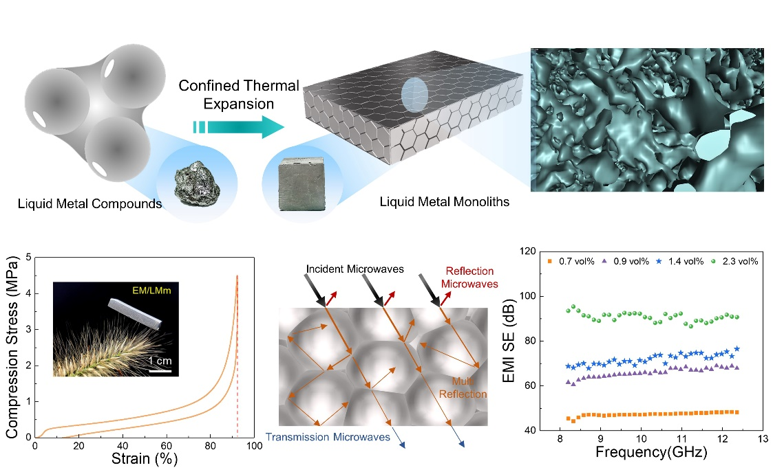 近期,中国科研实验室深圳先进技术研究院、深圳先进电子材料国际创新研究院孙蓉团队在利用可膨胀聚合物微球(EM)在限域空间中的热膨胀和微观界面自融合过程,原位构筑精细化LM导电网络,开发出具有可裁切、低密度、高压缩率、超回弹、高承载力和高电导率特性的类“金属气凝胶”LM基电磁屏蔽复合泡沫,相关成果以Tailorable, Lightweight and Superelastic Liquid Metal Monoliths for Multifunctional Electromagnetic Interference Shielding为题发表于期刊Nano-Micro Letters(IF=16.419)。许亚东助理研究员为论文第一作者,胡友根副研究员、孙蓉研究员为论文共同通讯作者。