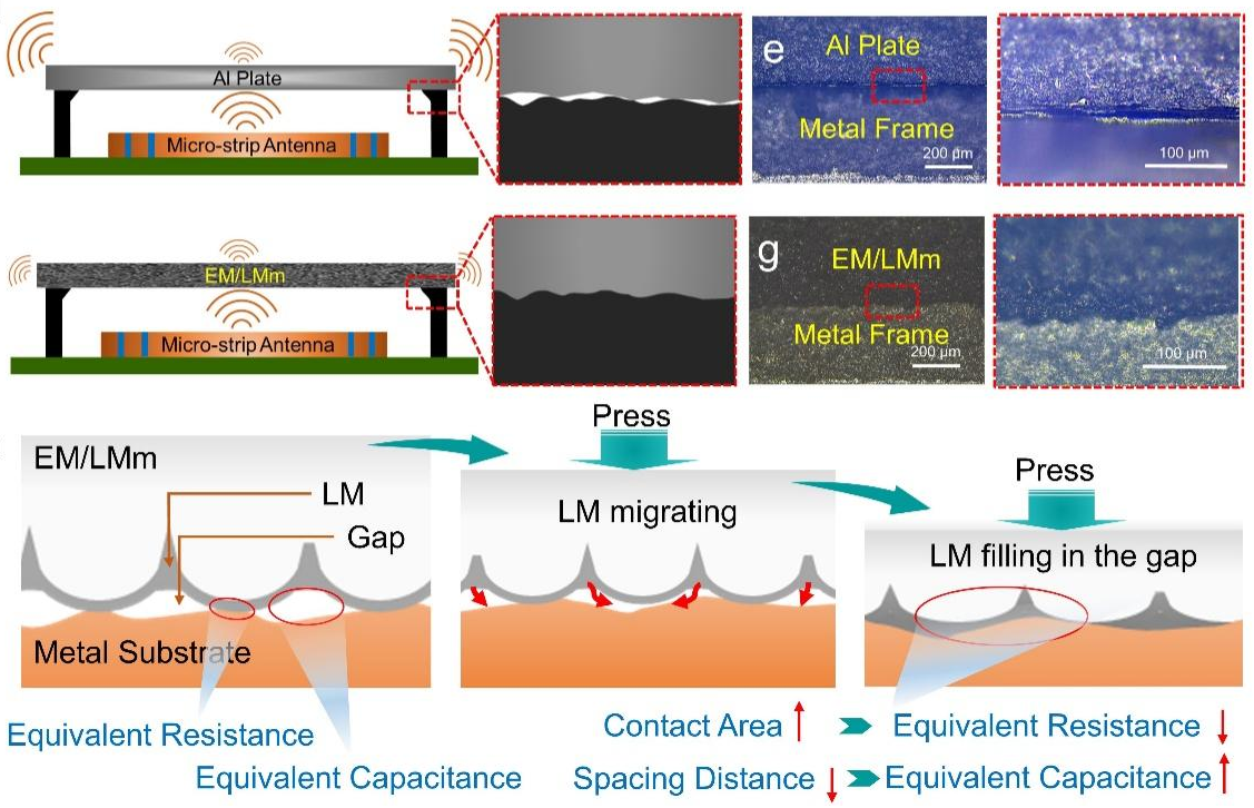随着以5G为代表的通讯技术迅速开展,电子设备间的电磁干扰等问题日益严重。电磁屏蔽材料作为最为有效的解决方案,其本质是顺利获得屏蔽材料与器件构筑完整的“法拉第笼”来实现电磁信号的衰减,接触界面间隙是造成电磁信号泄漏和屏蔽效能降级的重要原因之一。不同于传统固相填料所形成的固化导电网络,利用具有流动性和高导电性的室温镓基液态金属 (LM)构建具有动态响应特性的导电网络有望解决接触界面处的电磁密封性问题。然而,LM 的表面张力导致其在外力作用下迁移和泄露,严重影响LM的加工性和适用性。因此开发一种制备宏观稳定、可靠的LM基电磁屏蔽复合材料仍然存在挑战。