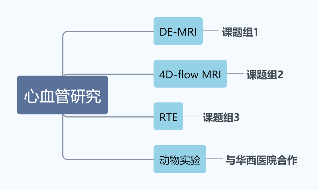 团队主要进行心血管研究,团队下设三个课题组(如图4所示),分别进行DE-MRI技术研究、4D Flow MRI技术研究和RTE技术研究,而动物实验主要顺利获得与华西医院进行合作。每个团队都在国际期刊上发表了顶级杂志的文章,描述了基于4D flow MRI成像的左心房流体力学变化介导的心房结构重构在心房纤颤的发生与开展作用及机制以及基于4D 磁共振和超声弹性成像技术的心房纤维化在心房颤动中的作用及机制。