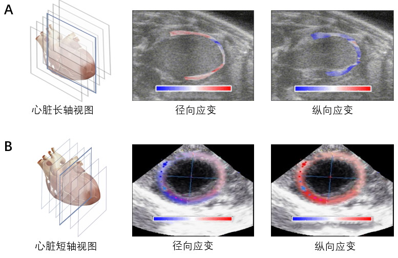 RTE测量方法。实验动物均常规建立静脉通道,麻醉状态下且给予心电监护。肌形变显像在客观评价心室功能的基础上,对取得有临床价值的信息具有重要作用。实时超声弹性成像技术(RTE)是一种利用超声射频数据提取心肌局部变形场的心肌变形成像方法。RTE利用心肌的自然收缩和松弛作为应变估计的机械刺激。如图6所示,A心肌的径向和纵向应变可视化结果,B心肌的轴向应变可视化结果。