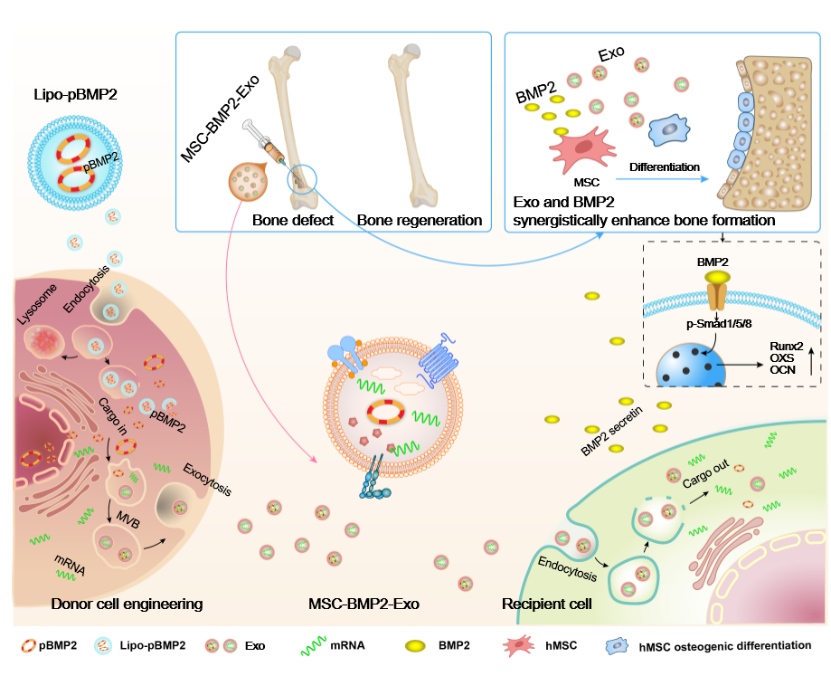 本研究结合基因递送技术,顺利获得骨形态发生蛋白2(BMP2)基因对来源干细胞进行工程化改造,促进其分泌的外泌体具有更加显著的成骨作用。顺利获得对干细胞进行基因工程改造的方法避免了直接改造外泌体带来的毒副作用,可以取得具有目的疗效和更强治疗效果的外泌体而应用于下一步的临床治疗中。该工作为利用外泌体促进骨再生的治疗给予了新的方法,同时也为顺利获得基因工程改造外泌体治疗其他疾病给予了新的思路和策略。