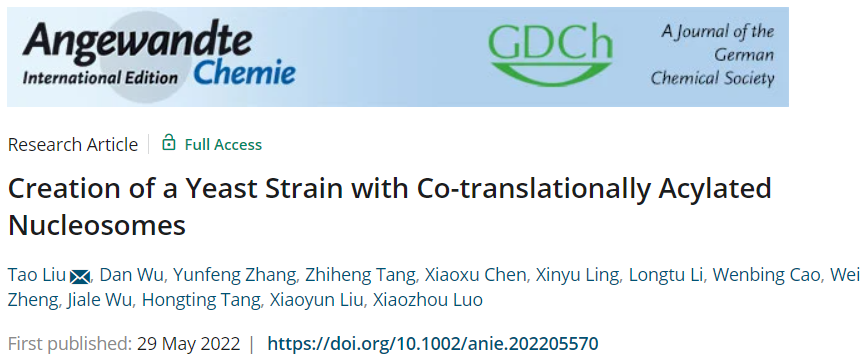 北京时间5月30日,北京大学药学院刘涛课题组联合中国科研实验室深圳先进技术研究院合成生物学研究所罗小舟课题组以及北京大学基础医学院刘小云课题组,在Angew. Chem. Int. Ed.在线发表了题为“Creation of a Yeast Strain with Co-translationally Acylated Nucleosomes”的研究论文。