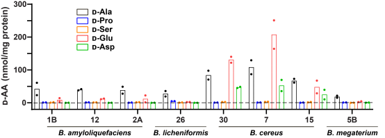 最后,鉴于DAAO对D型酸性氨基酸的活性较差,在确定了D型氨基酸的主要生产菌株后,作者顺利获得对其中产量最高的8株菌做进一步LC-MS/MS分析,对包括2种酸性氨基酸和宿主无法合成的D型丙氨酸在内的5种D型氨基酸进行准确定量。作者先将产物顺利获得SCX-SPE除盐并富集其中的氨基酸,并基于标准品计算这5种D型氨基酸回收率。根据标准品的保留时间和额外加样,作者确定了这些样品中5种目标D型氨基酸的含量(图3)。值得注意的是,蜡样芽孢杆菌的D型氨基酸产物谱中存在高含量的两种D型酸性氨基酸,它们可能也存在于其他DAAO酶标法阴性的样品中。