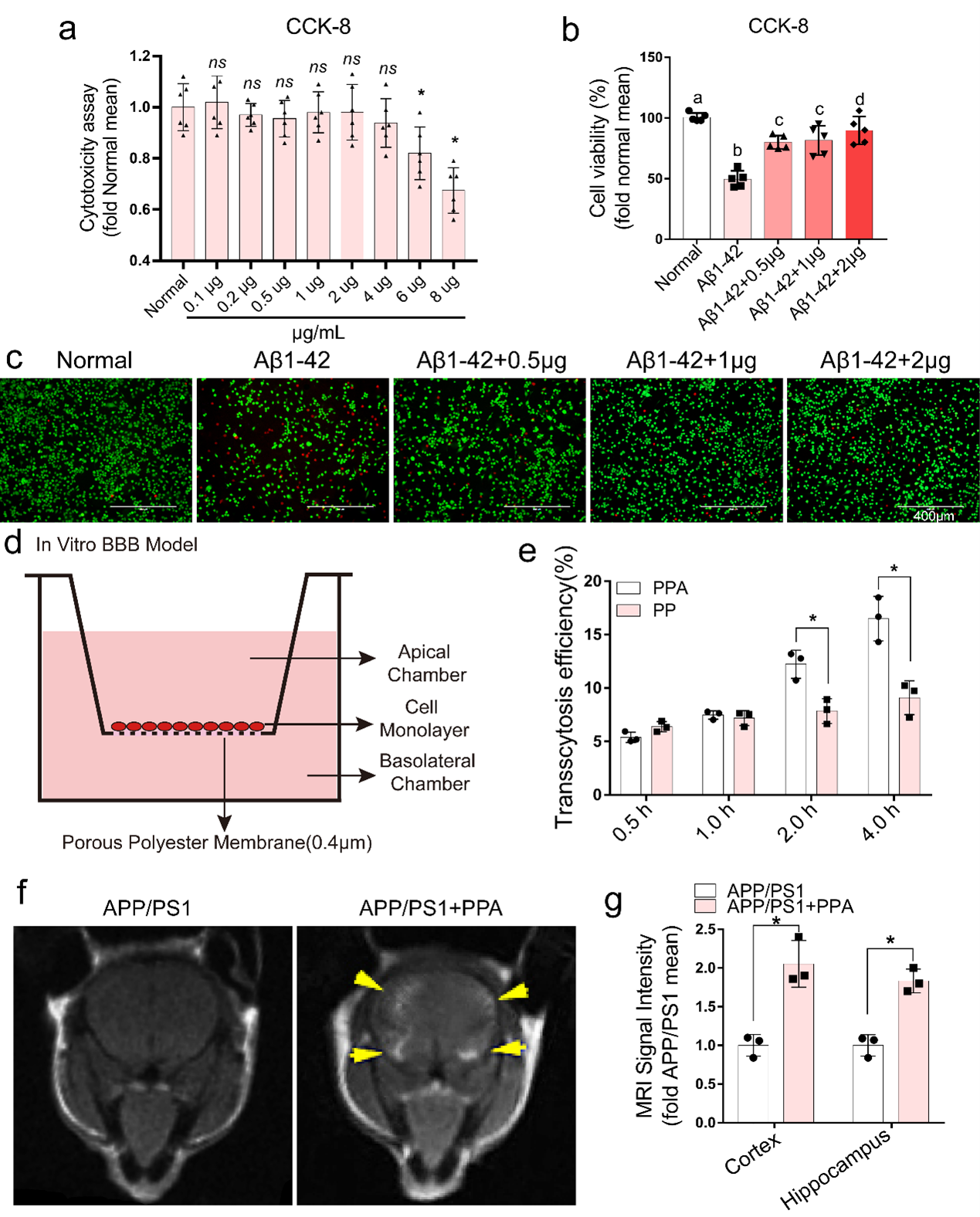 研究团队使用CCK-8检测PPA治疗后BV-2细胞的细胞活性, 0.5, 1.0, 2.0 μg/mL作为治疗浓度用于进一步实验(图3a),在该剂量下PPA纳米颗粒能够显著降低Aβ1-42(AD经典的体外造模剂)带来的细胞毒性,增加细胞活性 (图3b,c)。为了验证PPA纳米颗粒的BBB穿透性,体外BBB模型被构建,结果显示ANG-2的引入能够显著提升PPA纳米颗粒的BBB穿透性(图3d,e)。PPA纳米颗粒从小鼠尾静脉注射后的体内MRI成像也证明了PPA对BBB的穿透性(图3f,g)。