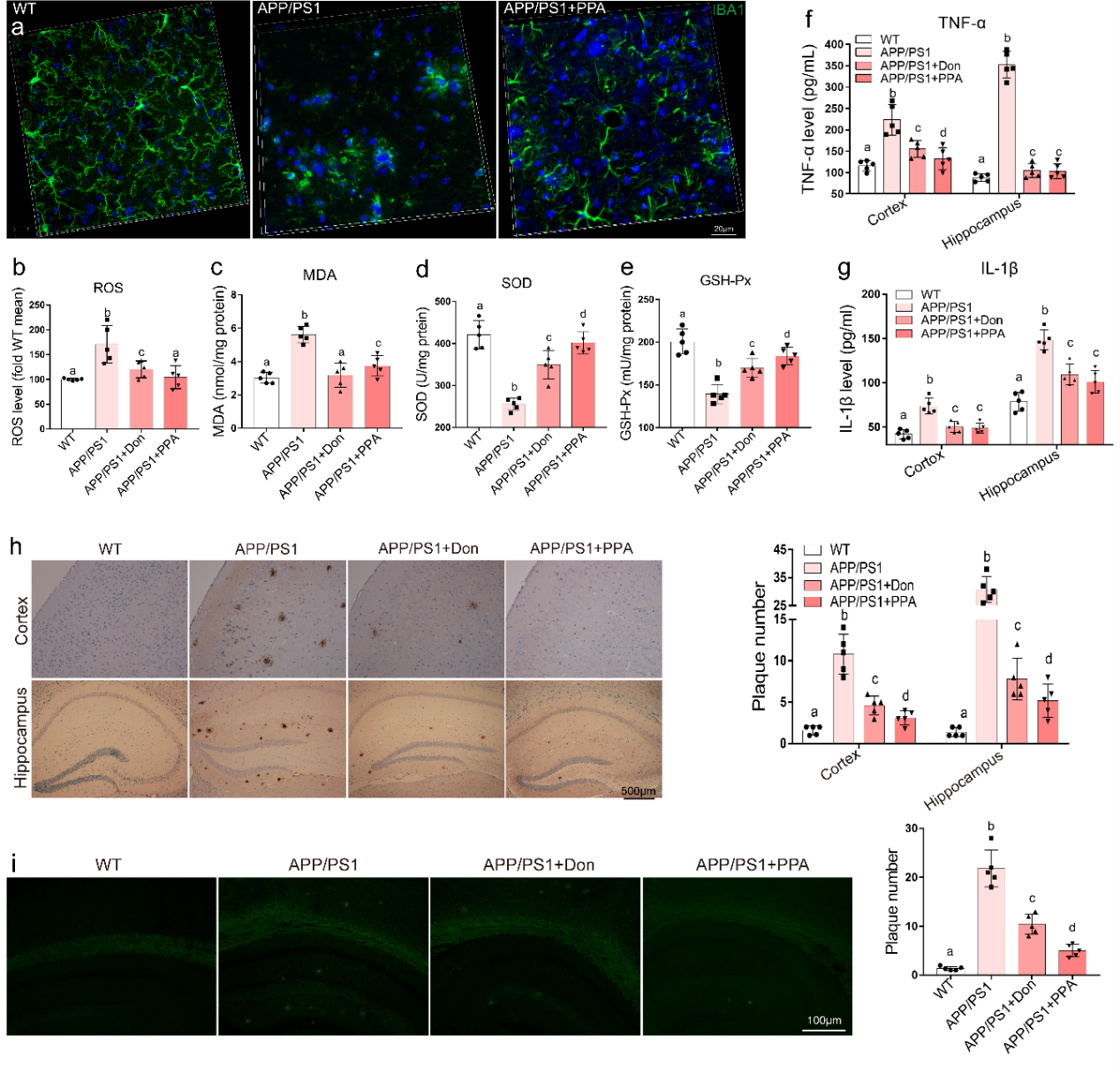 图4. PPA纳米颗粒抑制AD小鼠中小胶质细胞的过度活化以及抗炎抗氧化