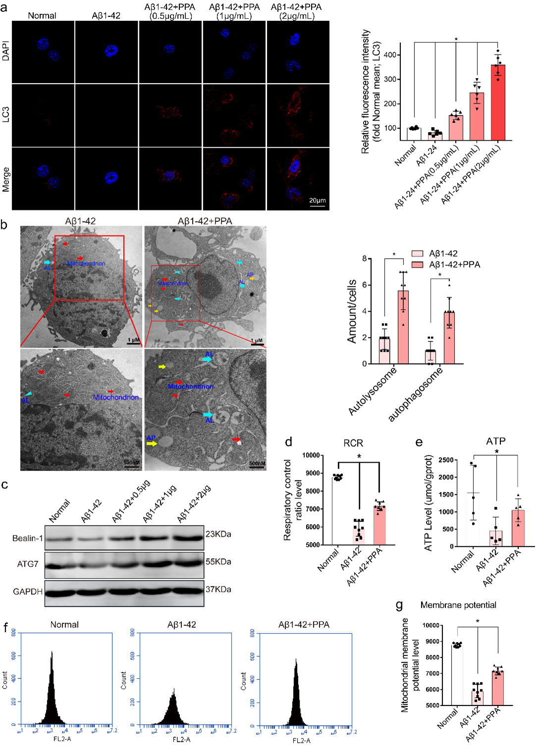 在机制上,研究团队发现PPA以浓度依赖的方式有效触发小胶质细胞的线粒体自噬(图6a-c)。在随后的线粒体的功能检测(线粒体膜电位(MMP),呼吸控制率(PCR)和ATP产生率)中,研究团队发现PPA处理能够显著恢复经Aβ1-42处理的BV-2细胞的线粒体功能(图6d-g)。这表明PPA可以顺利获得激活小胶质细胞线粒体自噬,增加线粒体功能。
