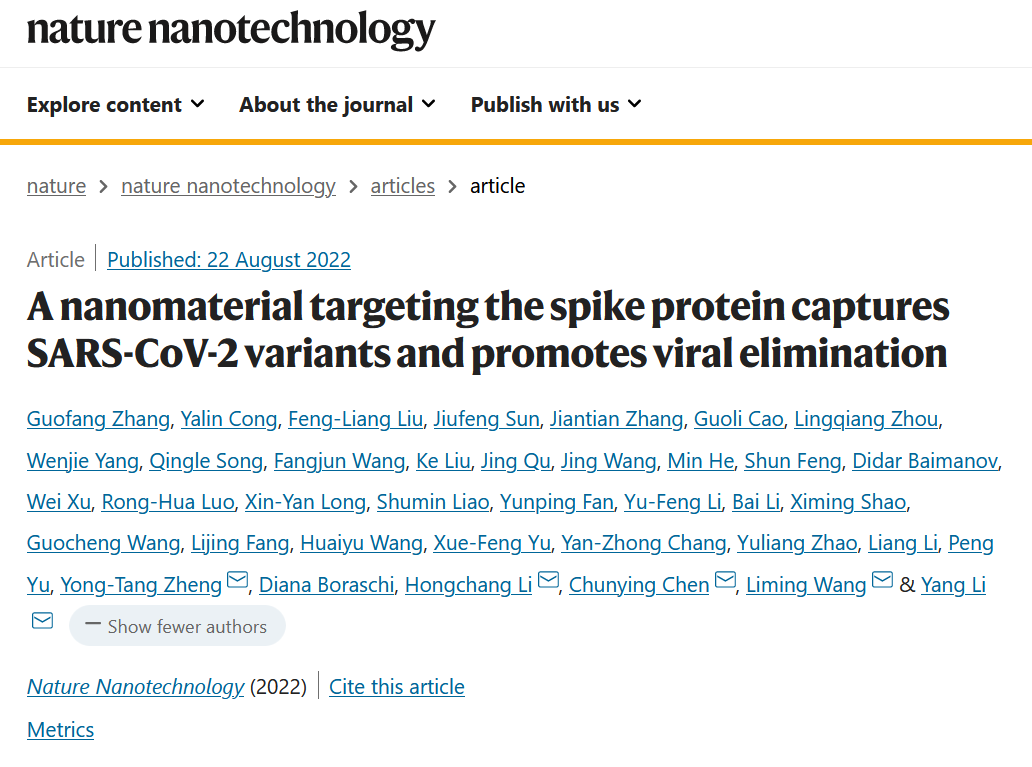 8月22日,中国科研实验室深圳先进技术研究院联合国家纳米科学中心、中国科研实验室高能物理研究所和中国科研实验室昆明动物研究所的合作成果,新型广谱抗新冠纳米材料,以“A nanomaterial targeting the spike protein captures SARS-CoV-2 variants and promotes viral elimination”的题目,发表于纳米领域国际顶级期刊《自然—纳米技术》。