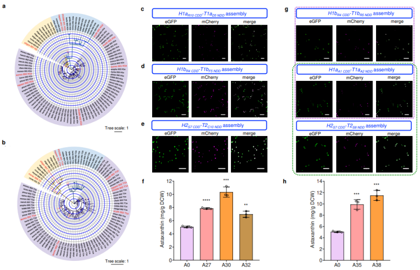 由不同分类的对接域形成的mPKSeal策略研究。在前期研究中,基于蛋白-蛋白共进化的生物系统聚类分析,研究人员将不同PKS来源的对接域进一步划分为不同类别:H1a–T1a, H1b–T1b,H2–T2等。为了进一步探究不同类别对接域组合应用的潜力,作者测试了来自不同PKS的多组不同类别的对接域组合应用,发现即使是不同PKS的对接域在同一分类下仍然能够有序组装,并实现虾青素产量的提升(图6)。