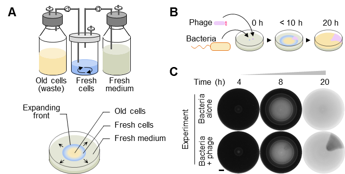 A,细菌空间扩展系统与陆续在培养装置的相似性;B,细菌-噬菌体共迁移实验示意图;C,实验结果