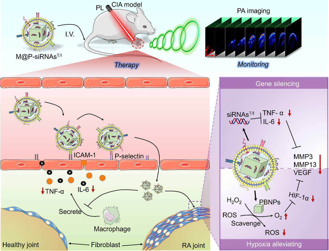 该研究联合使用小干扰RNA(siRNAT/I)和普鲁士蓝(PB)来沉默促炎细胞因子TNF-α/IL-6的表达,并清除RA微环境中过表达的ROS,同时缓解乏氧状态。为了提高siRNAsT/I和PB在体内的稳定性、生物相容性和炎症靶向性,研究人员顺利获得提取内源性巨噬细胞,然后刺激其产生具有同源性的膜囊泡作为仿生载体,合成了一种具有诊疗一体化功能的综合平台—M@P-siRNAsT/I(图1)。