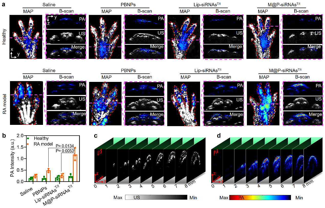 类风湿关节炎体内靶向光声成像研究。普鲁斯兰不仅具有催化酶作用,还具有很好的近红外光声成像特性。研究人员第一时间构建了一种CIA类风湿关节炎小鼠模型,顺利获得近红外光声成像对M@P-siRNAsT/I的体内行为进行三维实时监测。结果发现,相比商业化脂质体递送体系,M@P-siRNAsT/I可以高效的在类风湿关节炎足爪关节聚集,充分展示了仿生递送体系的炎症靶向能力(图4)。
