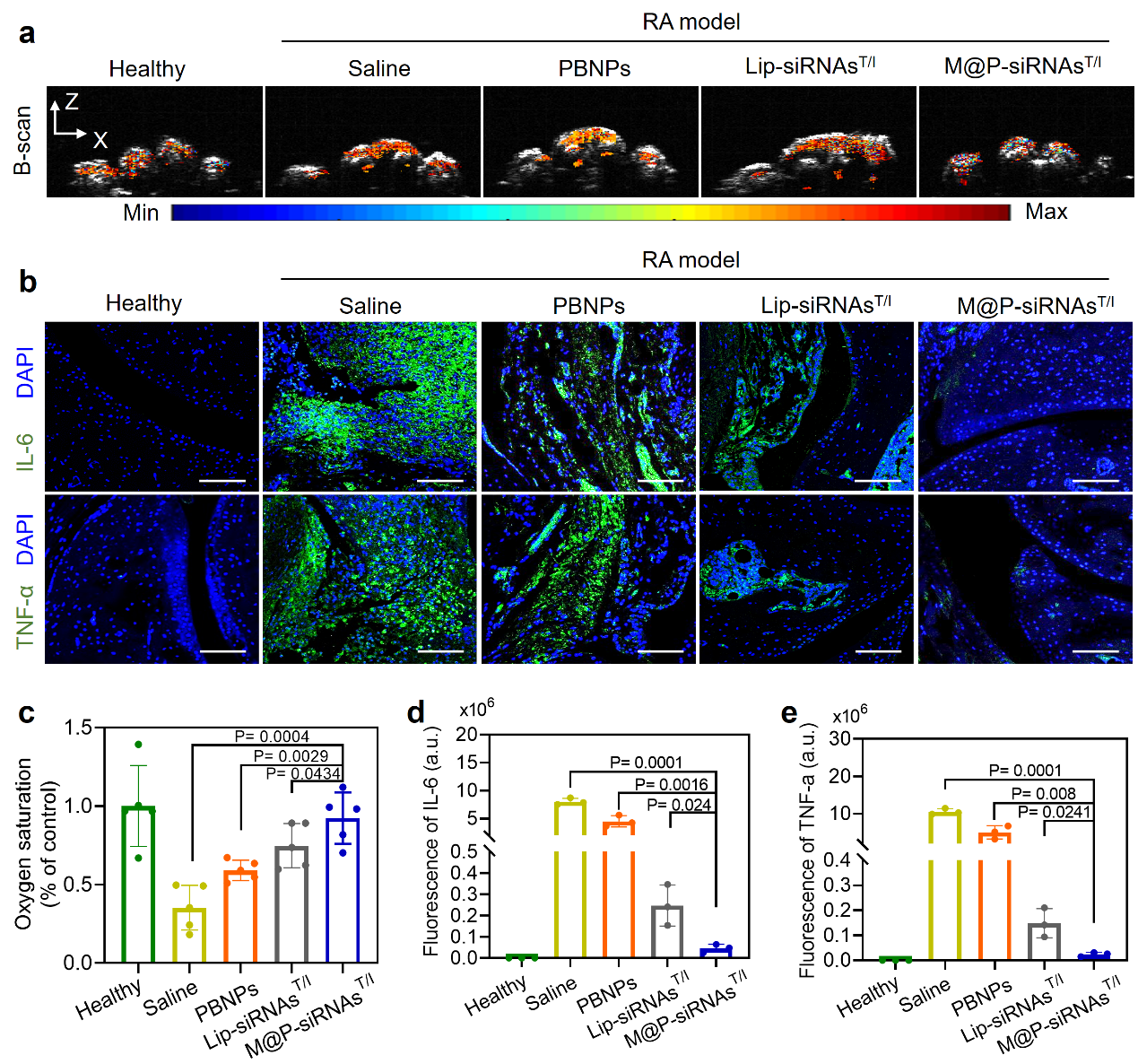 类风湿关节炎体内治疗和疗效评估研究。该研究第一时间顺利获得传统的micro-CT、病理染色、临床评分等方法对治疗后的关节病灶中骨及软骨破坏、免疫和炎症细胞浸润、炎症因子表达水平进行了检测,发现M@P-siRNAsT/I具有很好的在体治疗效果。同时,研究人员顺利获得无标记多光谱光声成像方法对关节病灶的血氧饱和度进行陆续在监测,发现治疗后的关节病灶乏氧状态得到有效缓解,这一结果得到乏氧相关蛋白HIF-1α的组织免疫荧光染色的进一步证实(图5)。