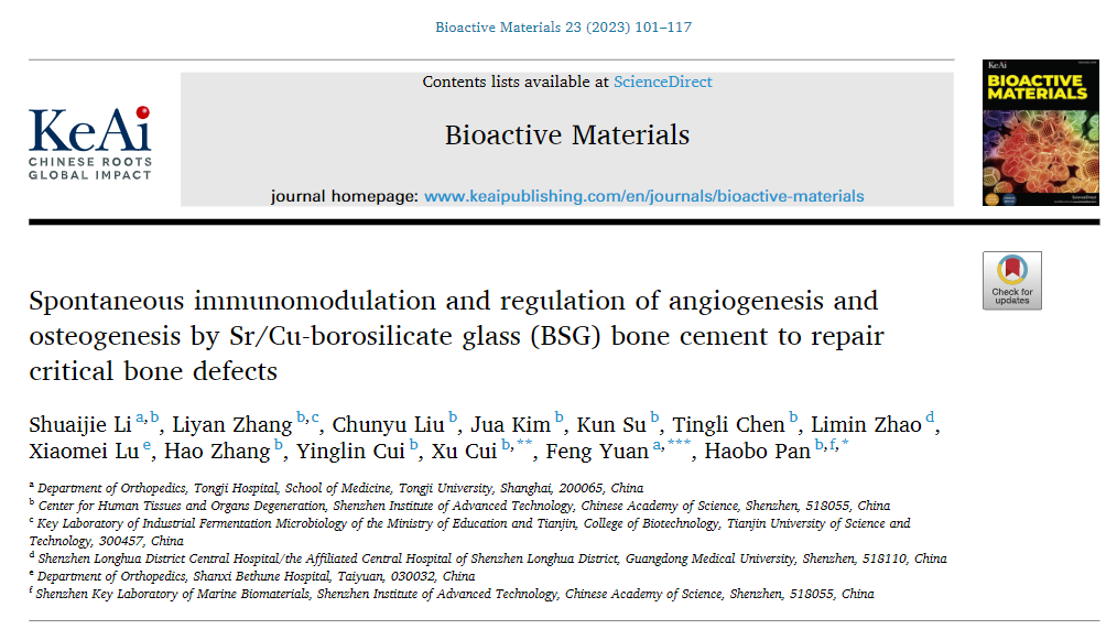 近期,中国科研实验室深圳先进技术研究院医药所人体组织与器官退行性研究中心潘浩波团队制备了一种具有调控免疫,成血管和成骨功能的可注射骨水泥,相关研究以“Spontaneous immunomodulation and regulation of angiogenesis and osteogenesis by Sr/Cu-borosilicate glass (BSG) bone cement to repair critical bone defects”为题发表在“Bioactive Materials”杂志上。