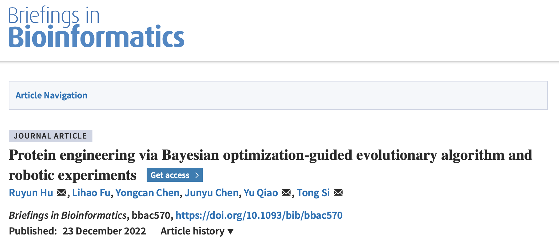 综上,文章依托深圳合成生物大设施,开发了蛋白质适应度地形的高效探索算法,率先实现了基于机器学习模型与机器人实验反馈迭代的自动化蛋白质工程改造。司同研究员、乔宇研究员和胡如云助理研究员为本文的共同通讯作者,胡如云助理研究员和博士生付立豪为本文共同第一作者。本研究得到国家重点研发计划、国家自然基金及深圳合成生物学创新研究院等项目支持。
