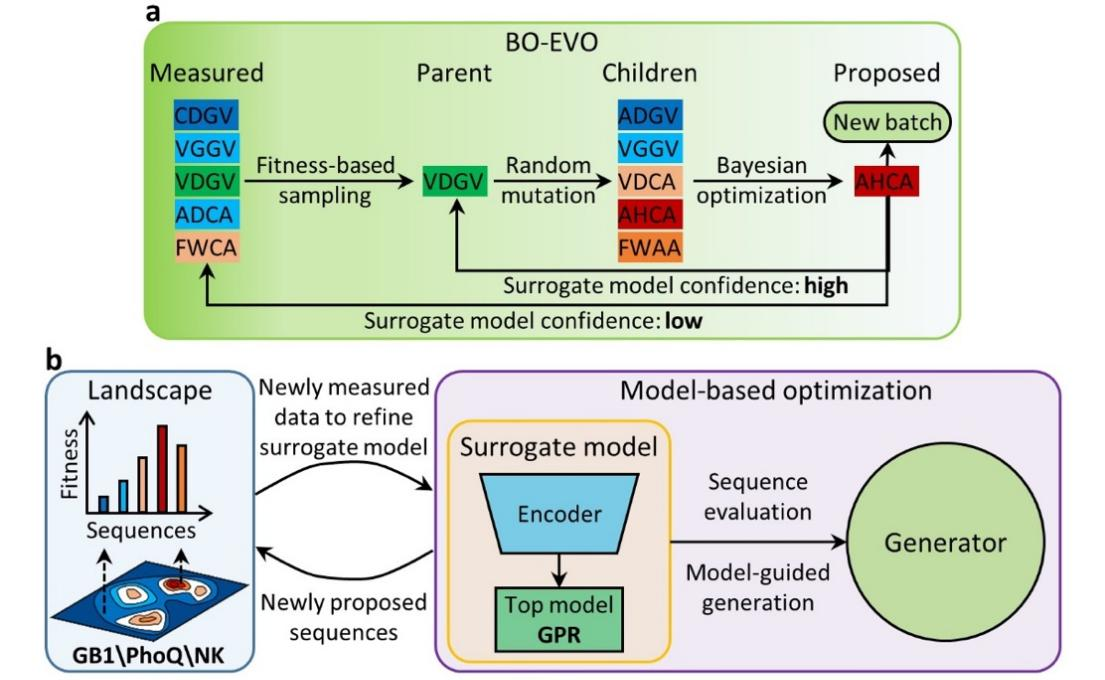为了实现机器学习算法与机器人实验之间的高效反馈,数据获取、模型构建及序列推荐三者缺一不可,需形成闭环。就算法而言,贝叶斯优化正适用于这种复杂适应度地形的寻优,其可利用预测模型的不确定性构建采样函数以平衡“探索与利用”。然而,经典的贝叶斯优化方法并不适用于高维问题及批量采样。本研究针对蛋白质多位点组合突变设计空间的高维搜索难题,开发了贝叶斯优化指导的进化算法(BO-EVO,图1)。作者在研究中提出了搜索空间演化策略,克服经典贝叶斯优化的可扩展性问题,采用迭代式批量化采样策略,实现与高通量、自动化实验平台的高效适配。