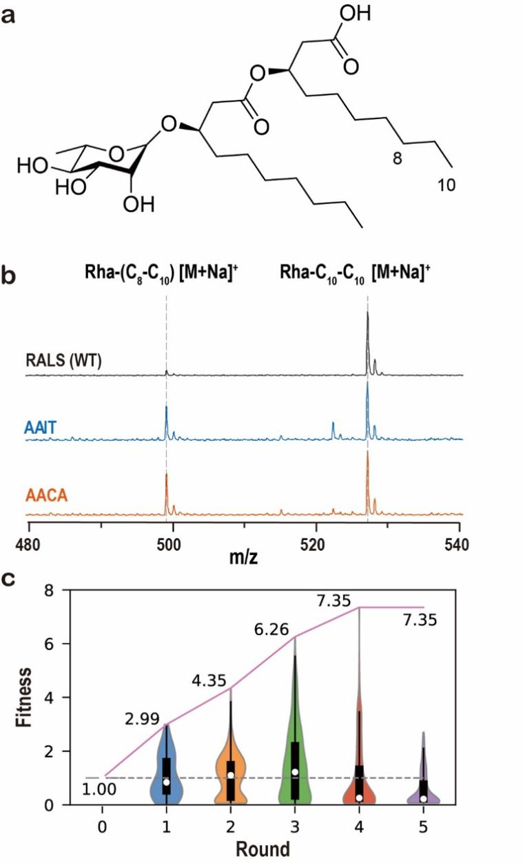 图4. BO-EVO指导RhlA酶的4位点组合优化。a. 鼠李糖脂单体Rha-C10-C10分子结构;b. 鼠李糖脂单体的MALDI质谱检测结果,包括野生型与典型变体;c. Rha-(C8-C10)的归一化产量,野生型为1。