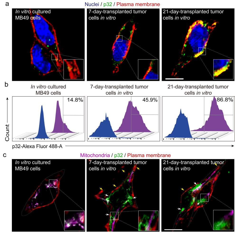 为了确认肿瘤细胞表面增加的p32是否来自线粒体,研究人员顺利获得免疫荧光染色进一步检测了p32蛋白在这些肿瘤细胞中的亚细胞定位。结果表明,体外培养肿瘤细胞的p32蛋白主要位于线粒体中,在质膜上几乎检测不到p32蛋白的免疫荧光信号,而在移植7天小肿瘤和21天大肿瘤的肿瘤细胞中,p32蛋白定位在细胞膜上的量逐渐增加(图1c)。这表明随着肿瘤的进展,p32蛋白经历了从线粒体到细胞膜的易位,越来越多的p32蛋白易位到了肿瘤细胞的表面。