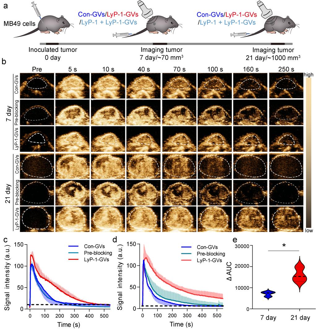 为了实现肿瘤p32易位的超声分子成像检测,研究人员利用LyP-1靶向多肽顺利获得化学偶联的方法连接到嗜盐古菌合成的气体囊泡表面,制备了靶向p32蛋白的超声分子影像探针LyP-1-GVs,顺利获得向荷瘤小鼠尾静脉分别注射LyP-1-GVs和对照探针Con-GVs,利用临床超声成像诊断设备对肿瘤部位进行超声造影成像。