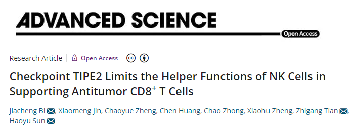 [8] Bi J*, Huang C, Jin X, Zheng C, Huang Y, Zheng X, Tian Z*, Sun H*. TIPE2 deletion improves the therapeutic potential of adoptively transferred NK cells. J ImmunoTher Cancer, 2023.