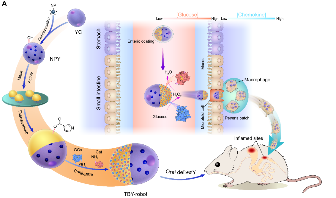 大自然合成了大量结构复杂、性能优越的材料,为构建具有优良生物相容性的智能微纳生物机器人给予了灵感。该工作提出了以酵母益生菌来源的酵母微囊为活性材料,顺利获得将葡萄糖氧化酶和过氧化氢酶偶联在包裹纳米药物的酵母微囊表面,制备了具有不对称结构的酵母微纳生物机器人(TBY-robot)。