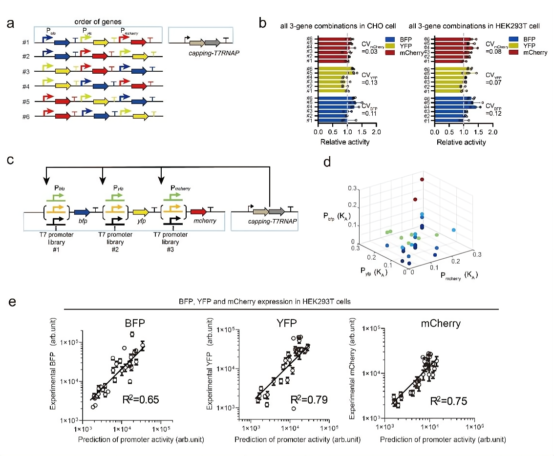 在哺乳动物细胞中,多个基因的先后顺序也会显著影响基因表达量。为了研究基因先后顺序对基因表达量的影响,研究团队设计了三个报告基因的六种可能的先后顺序(1-2-3, 1-3-2, 2-1-3, 2-3-1, 3-1-2, 3-2-1),并计算了报告基因在所有六种组合中的表达量的方差 (图3)。作者们发现同一启动子的表达量的方差系数(CV) 非常小。这个结果表明启动子活性不受其局部基因环境的显著影响,而且在CHO和HEK293T细胞株中都保持类似行为。另外,研究团队在50个启动子库中,针对三个不同报告基因任意选择其启动子(活性变化100倍左右)。顺利获得修正的热力学模型,文章预测了三种报告基因的活性。根据实验结果发现哺乳动物细胞中的三个基因的蛋白表达量都可以由模型预测(R2=0.81~0.88)。