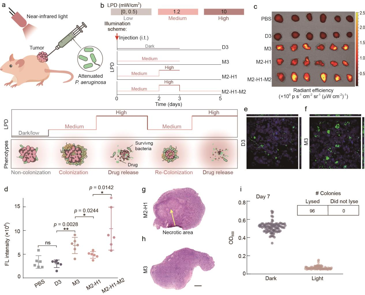 随后,研究团队使用小鼠皮下瘤模型探究能否顺利获得近红外光控制工程菌在瘤内的生活方式并实现预期的功能(图4)。结果显示,在瘤内注菌后,避光培养三天组的小鼠(D3)肿瘤组织内的细菌数量与注射PBS组没有显著差异,表明进入浮游状态生活方式的细菌难以在肿瘤内定殖;中等光强照射三天组的小鼠(M3)肿瘤组织内的细菌数量与D3组相比显著增加,表明进入生物被膜状态生活方式的细菌在肿瘤组织内的定殖能力大大增强;中等光强照射两天高光强照射一天组的小鼠(M2-H1)与M3组相比,细菌数量显著降低,且M2-H1组的肿瘤组织切片中能够看出明显的坏死区域,表明细菌裂解后释放药物并杀伤了肿瘤细胞;中等光强照射两天高光强照射一天再中等光强照射两天组的小鼠(M2-H1-M2)与M2-H1组相比,细菌数量再次上升,这表明细菌在中等光强照射后,再次进入定殖生长状态。此外,在中等光强近红外光照射七天后,瘤内的工程菌仍然具有裂解能力,表明该基因线路具有较好的稳定性。综合以上结果可知,不同强度的近红外光照射能够使瘤内细菌进入对应的生活方式并实现预期的功能,而顺利获得陆续在改变的光照程序能够实现对瘤内细菌生活方式的持续控制。