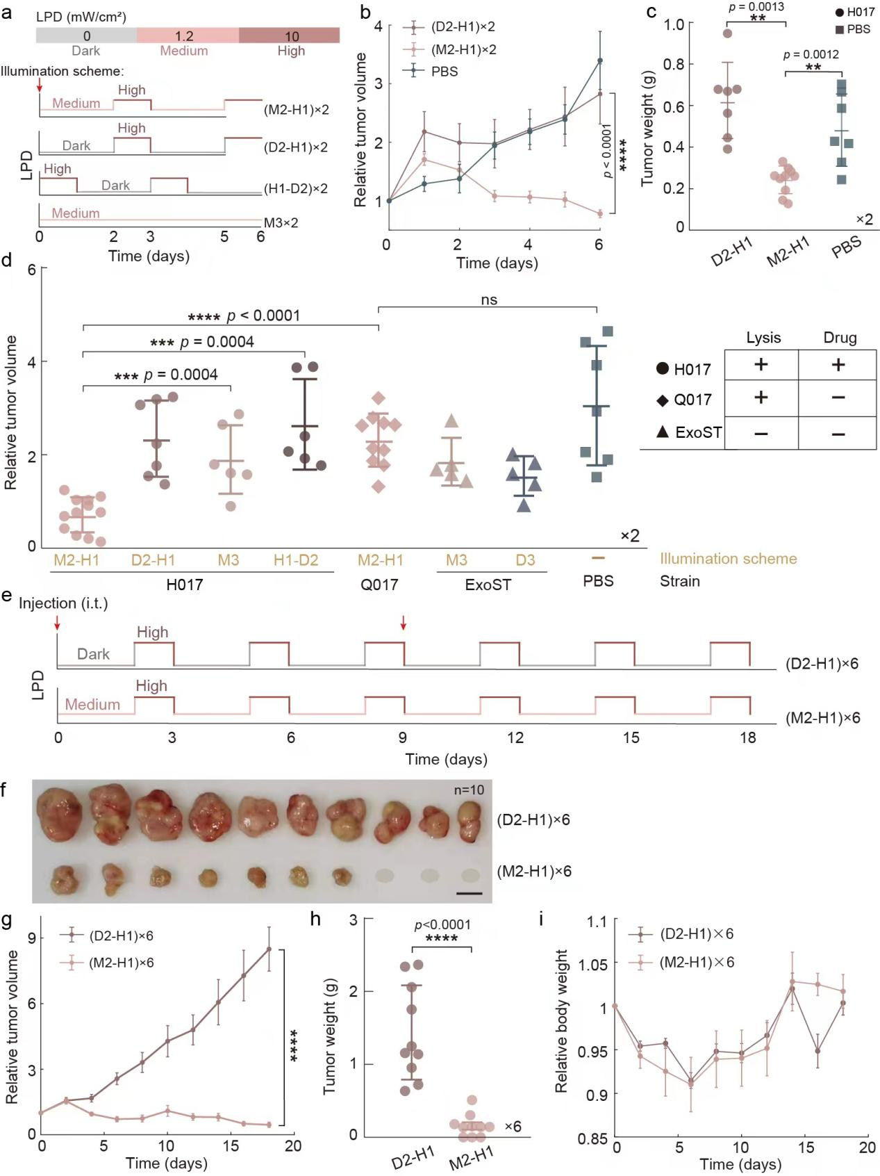 最后,研究团队探究能否顺利获得编程工程菌生活方式增强其肿瘤治疗效果(图5)。当H017仅作为药物递送载体时,高强度的近红外光光照能够使H017裂解释放药物,完成肿瘤治疗。团队在20天的实验周期内,顺利获得8次注菌,有效抑制了肿瘤生长。接下来,研究团队顺利获得光照程序对细菌的生活方式进行控制,以实现对药物累积和药物释放的持续控制。结果显示,在对小鼠施加两个循环周期的中等强度2天-高强度1天的近红外光光照程序(M2-H1×2)后,小鼠肿瘤生长受到了抑制,而对照组无法抑制小鼠肿瘤生长。在更长周期的实验中(M2-H1×6),顺利获得光照时间编程细菌生活方式进行肿瘤治疗使所有小鼠的肿瘤生长受到了抑制,其中30%小鼠的肿瘤完全消失,而对照组小鼠的肿瘤则持续生长。以上结果表明,编程细菌生活方式在肿瘤的长期治疗过程中具有显著优势,能够在较少的注菌次数下取得更好的肿瘤抑制效果。