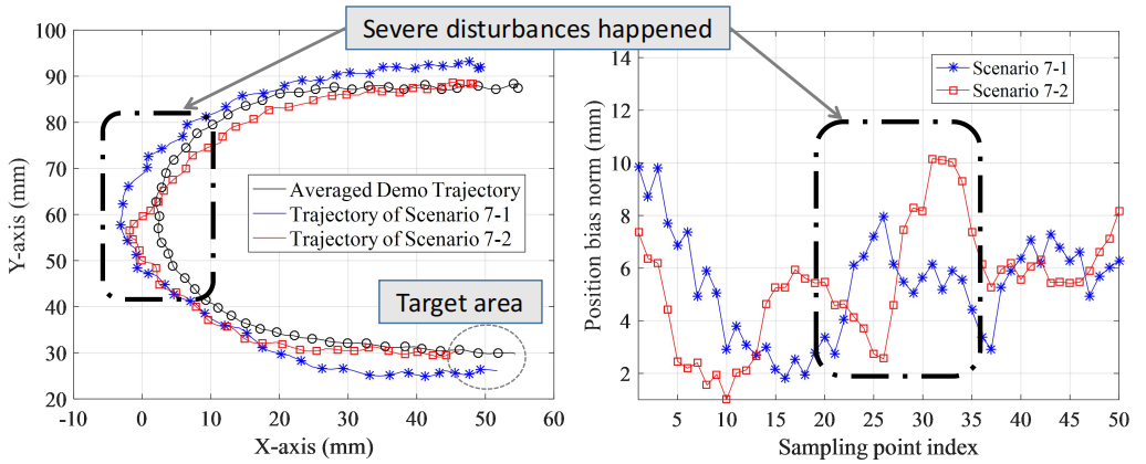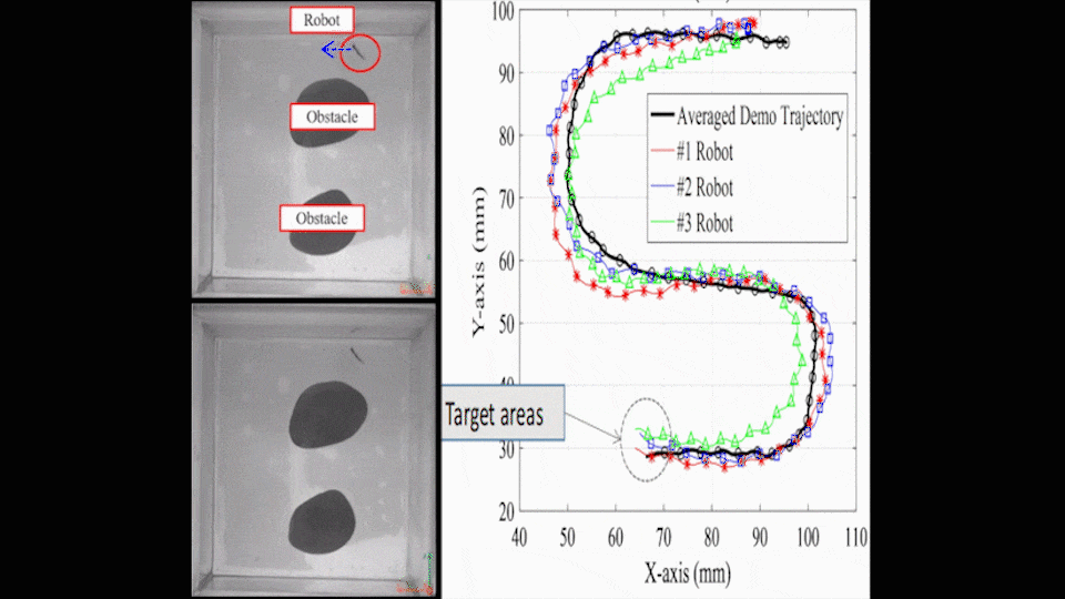 顺利获得仿真及实验,研究团队运用所提的学习控制方法取得了锐角弯、J形弯、S形弯等多种运动基元的微型机器人控制器,并召开了仿鱼机器人避障运动实验。在机器人运动过程中我们顺利获得人为摇晃容器、暴力碰触机器人模拟了真实场景中可能存在的复杂扰动,机器人在复杂环境中,直接调用C形弯,S形弯等运动基元实现高效避障,顺利获得使用所提方法机器人均可以抵达最终指定区域,验证了所提方法的强抗扰能力。该成果符合高层运动指令规划的思想,大幅简化了实时控制指令解算复杂度,为微型机器人的多机集群运动或无参考轨迹最优运动规划打下基础,同时还可推广至无人机、无人车以及工业机器人的复杂运动控制。