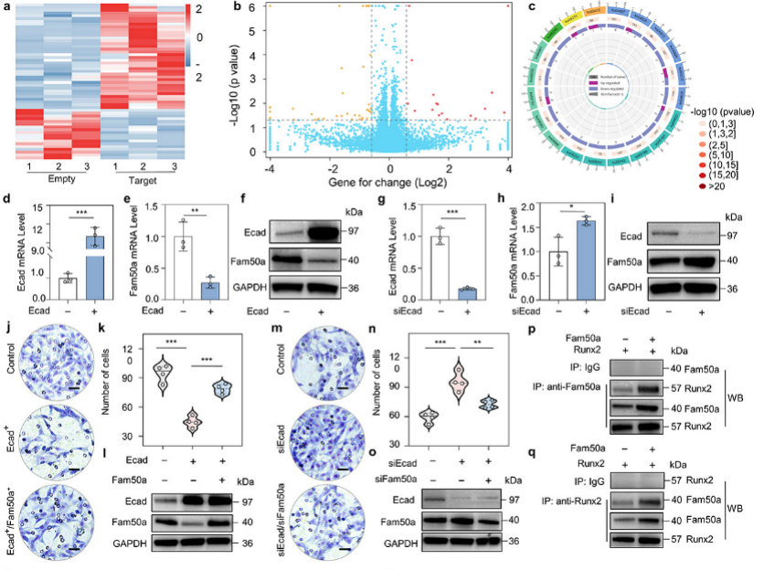 为了进一步挖掘超声胞内空化递送E-cadherin在G2/M期具有更好抑制肿瘤转移的机制,研究团队顺利获得转录组测序、qPCR、WB和CO-IP等分子实验,发现在肿瘤细胞G2/M期过表达E-cadherin会导致Fam50a基因的下调,进而减少Fam50a/Runx2的相互作用及其转录激活功能,最终导致MMP13的下调,揭示了超声胞内空化核内递送E-cadherin基因在细胞周期G2/M期发挥更好抑制肿瘤转移的机制。