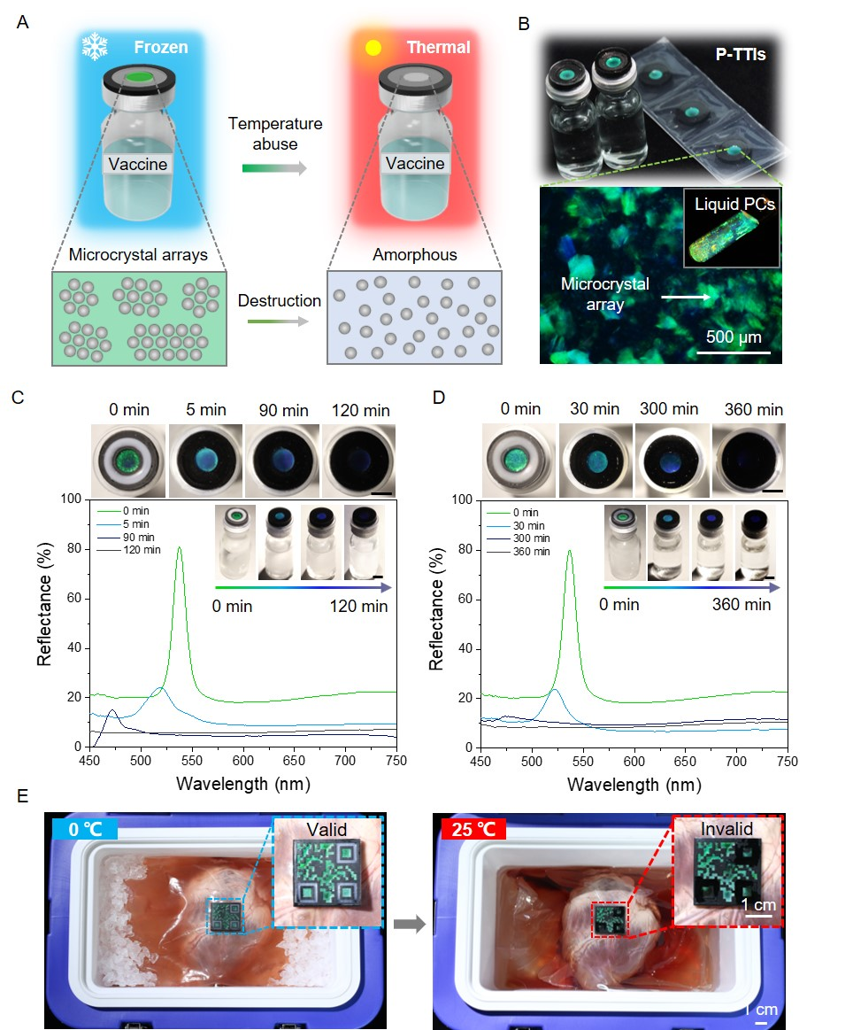 图1:基于自毁型液态光子晶体的新型智能时间温度指示标签,及其用于疫苗和离体器官热暴露历史的可视化监测