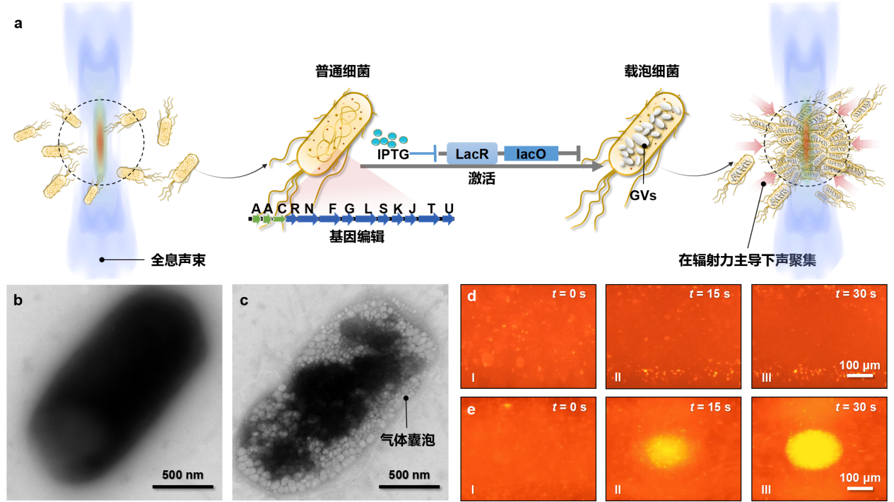 从理论研究层面,研究团队提出复杂声场环境中声辐射力离散表达与计算理论,解决了复杂声场的任意结构微粒受力量化表征的瓶颈问题,并探究了复杂环境中空间声场作用下操控目标的动力学行为。从工程研发层面,团队成员马腾研究员等顺利获得长期的技术探索与积累,攻克了高密度声镊换能器研发中声场设计和制造工艺难题,成功研制了二维高密度超声换能器阵列,利用全息元素构建和时间复用的方法,结合多通道高精度时间反演超声激励,实现了强梯度声场生成复杂声场的时空动态调控从生物医学应用层面,团队中严飞研究员等利用基因编辑技术,在细菌细胞中产生了亚微米气体囊泡,显著提升细菌的超声敏感性,大幅增强其受到的声辐射力,使得含气囊细菌可以克服流体拉力,驱使它们在焦点区域聚集形成团簇(如图3