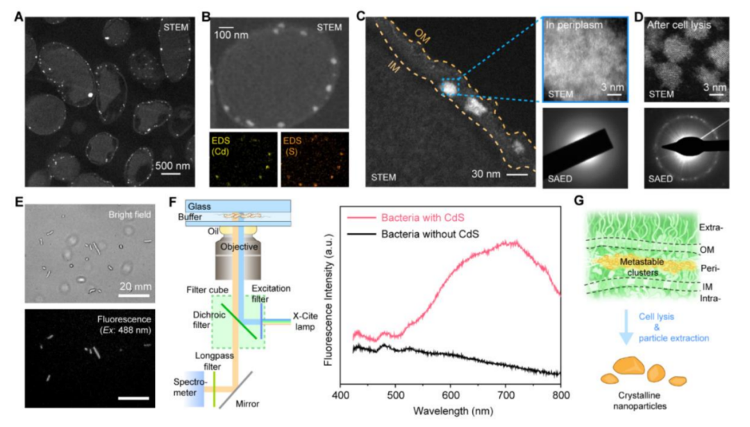 团队顺利获得在大肠杆菌周质空间靶向合成半导体材料(纳米光伏颗粒),将半导体材料吸收光能产生的电子高效转化为细菌胞内的生物能。具体来说,研究者在顺利获得大肠杆菌在胞内利用半胱氨酸(Cys)合成H2S, 因H2S具有极高的膜通透性(比水分子高3个数量级),可快速扩散至周质空间并与摄入到周质空间的Cd2+反应,形成相应的CdS纳米颗粒外壳。 科研团队使用基于同步加速器的3D-X射线荧光光谱(3D X-ray fluorescence)和描透射电子显微镜 (STEM)确认大肠菌成功合成CdS纳米颗粒;制备材料-细菌杂合体的超薄切片,顺利获得STEM分析,发现CdS纳米颗粒主要分布在周质空间内,大小约为29.3 nm,其结晶度低;进一步利用超声破碎细胞、溶剂提取和分散细菌中的CdS纳米颗粒,发现其大小仅为6 nm左右,且结晶度提高,说明周质空间原位合成纳米颗粒可能为多个CdS“纳米团簇(nanoclusters)”(约5个),其结晶度降低,但依然赋予了生物杂合体荧光特性,荧光成像和荧光光谱表明周质空间合成的CdS纳米团簇是亚稳态的,主要是无序和富含缺陷的聚集体。
