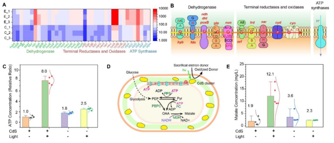 转录组还显示周质空间内合成CdS的细菌杂合体在光照的条件下,与氧化呼吸链相关的基因(包括甲酸脱氢酶、NADH脱氢酶、甘油醛-3-磷酸脱氢酶、丙酮酸氧化酶、d -乳酸脱氢酶和葡萄糖脱氢酶)和ATP合成酶相关基因均显著上调,表明CdS吸收光能产生的电子加速了细菌氧化呼吸链电子传递速率,因此可能提高ATP的合成。为了验证这一推测,研究人员对杂合体胞内ATP浓度进行分析,发现杂合体在光照条件下比黑暗条件下的ATP高8.1倍,并应用于提高ATP有助于的合成途径的代谢通量。