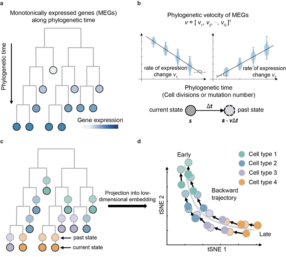 在本文中,作者提出利用单细胞系统发育树的枝长信息代替物理时间,联合单细胞转录组数据,可以研究基因表达随着枝长(即时间)的变化规律,特别是鉴定随细胞分裂而表达量呈单调递增或递减的基因(即单调表达基因),其RNA变化速度可以利用分子演化模型进行定量估计,从而构建单细胞转录组速度场,实现对细胞分化轨迹的高精准推断(图1)。