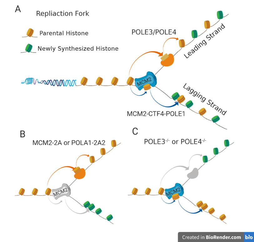 近年来,甘海云研究员与合作者顺利获得开发eSPAN (enrichment and sequencing of protein-associated nascent DNA)技术,发现了DNA复制过程中传递亲代组蛋白的分子伴侣,揭示了亲代组蛋白遗传的分子机制。Mcm2(Mcm2-7解旋酶的一个亚基)顺利获得与Ctf4和Pola1的相互作用将亲代组蛋白传递到复制DNA的滞后链(1)。而Pole3和Pole4(前导链DNA聚合酶的两个亚基)则顺利获得相互作用促进亲代组蛋白传递到前导链(2)。在DNA复制过程中Mcm2-Ctf4-Pola1和Pole3/Pole4保证了亲代组蛋白及其翻译后修饰在姐妹染色单体上的对称分配(图1)。然而,DNA复制中亲代组蛋白如何调控表观信息传递及其生物学意义尚不清楚。