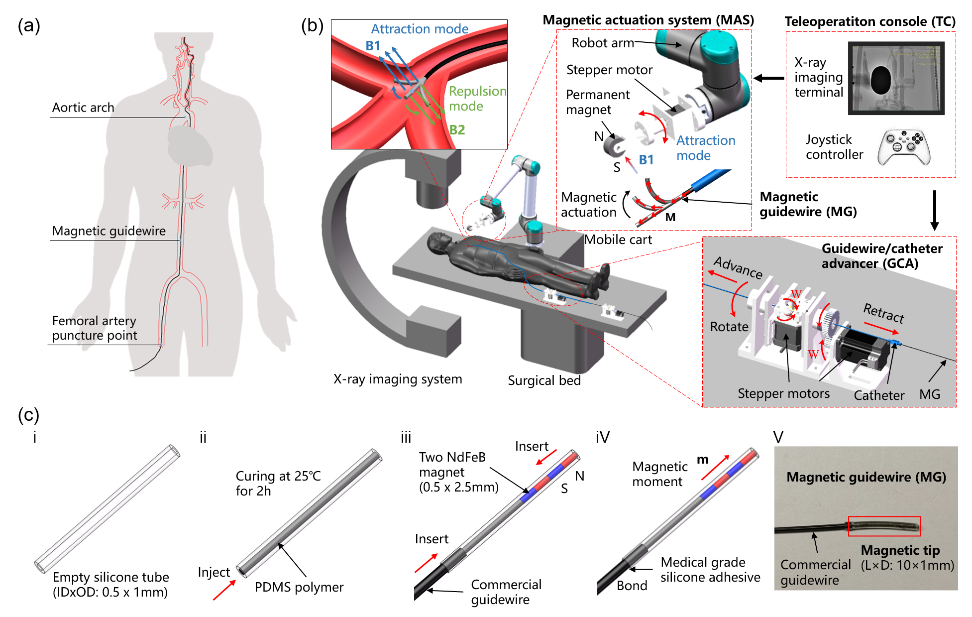 研究成果以A Magnetically Controlled Guidewire Robot System with Steering and Propulsion Capabilities for Vascular Interventional Surgery为题,发表在智能系统领域权威期刊Advanced Intelligent Systems (JCR一区,影响因子:7.4)。智能仿生中心徐天添课题组博士研究生付仕雄为第一作者,先进院徐天添研究员和深大华南医院杜世伟主任医师为通讯作者。