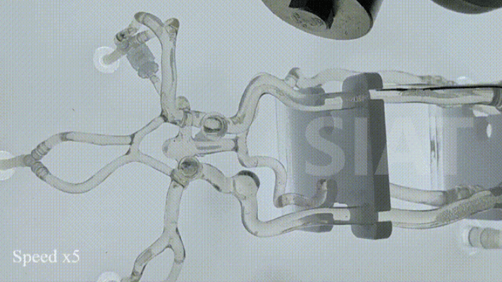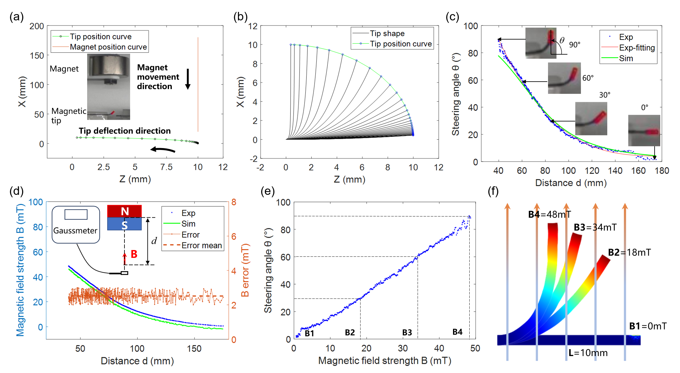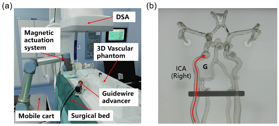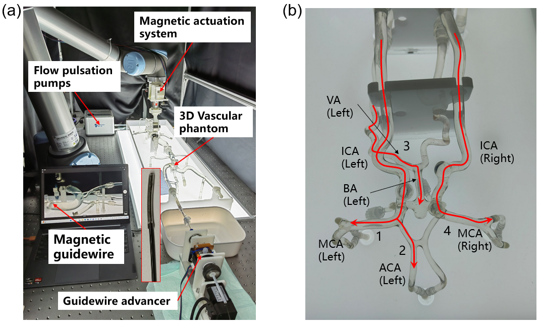 血管介入手术是在医学影像设备的导引下,利用导丝、导管等器械经血管途径诊疗的操作技术。神经介入手术是治疗各种脑血管疾病的重要手段,对医生经验要求很高。偏远地区的介入医疗资源紧缺。医生需要在造影下观察导丝位置,累积的辐射有损健康。对此,团队提出一种具有磁驱动主动转向和自主推进能力的磁性介入导丝机器人系统,可以协助医生远程操控,或替代医生自动化控制,能有效减少医生的辐射暴露和支援偏远地区。团队在导丝的尖端连接一段磁性水凝胶材料,使医用介入导丝具有磁响应,可在外部磁场的驱动下灵活转向,并顺利获得影像系统反馈位置。团队结合偶极子模型和Cosserat-rod模型,建立了陆续在体力学模型预测导丝尖端的变形,并开发了轨迹规划算法,根据血管的路径推断外部驱动磁铁的位置轨迹和推进器速度实现自主控制。