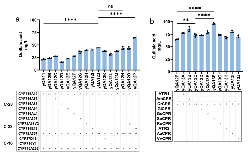 研究人员随后顺利获得再次迭代筛选候选CYP和CPR,发现表达两个拷贝的CYP72A567和一个拷贝的CYP714E19时QA的产量要高于表达三个拷贝的CYP72A567(图四),再一次证明了CYP氧化的网络效应存在。而在CYP网络中引入能与CYP72A567和CYP716A262更好组合的SaCPR,也可以进一步提高QA的产量。顺利获得在菌株yQA11中再增加一个拷贝的CYP72A567,并引入CYP714E19和SaCPR得到菌株yQA12P,QA的产量增加了350%,达到95.9 mg/L。