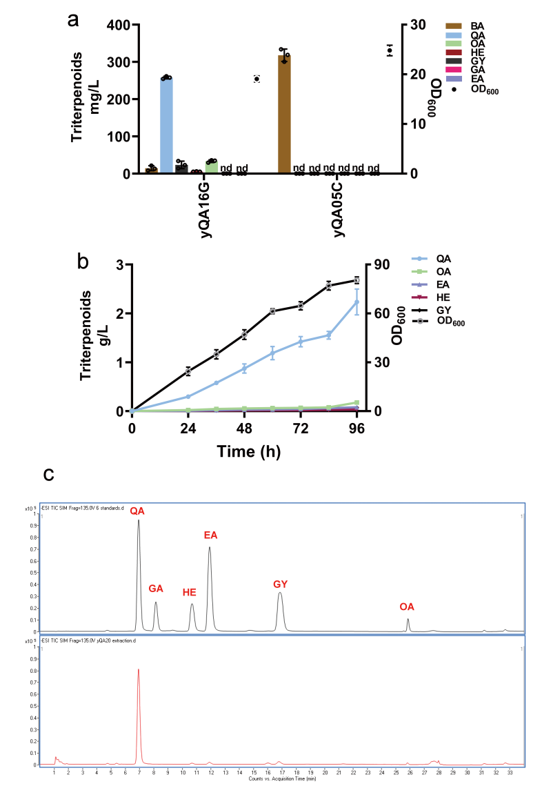 虽然强化代谢流通量是提高产量的有效手段,但是研究人员发现过表达酿酒酵母内源的erg1只能增加双位点的氧化产物如EA和HE的产量积累,并不能增加QA的产量,从而证明单纯增加前体供应对于三位点氧化产物的积累影响较小(图三)。