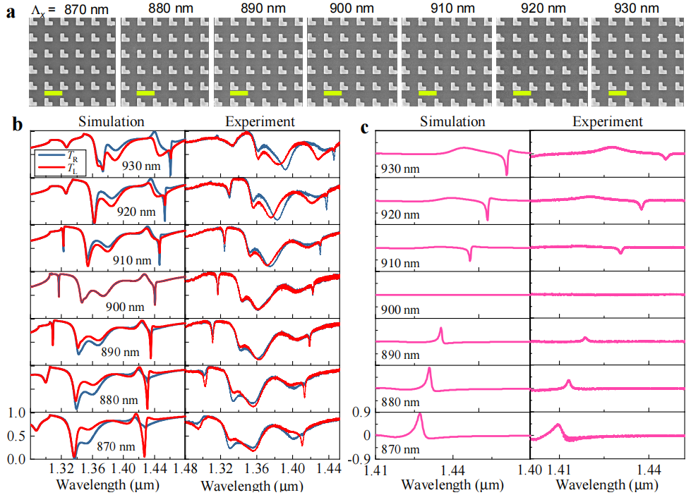 本研究采用常规的微纳加工工艺,制备了一系列不同周期、高度为300纳米的等臂长“L”字形硅柱,实验测量结果与仿真结果非常吻合,波长1.44微米附近的窄峰顺利获得不等周期诱导产生了手性。当Px=Py时,透射谱没有手性,当Px=/Py时,透射谱具有明显的手性,最大圆二色值达到0.37,此时Q值高达1220。研究发现,Px>PyPx<Py时圆二色值的正负发生了反转,这意味着利用周期可以实现圆二色性的调控。