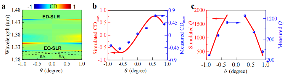 研究人员进一步研究了等周期时该结构在斜入射下的外在手性,仿真与实验结果表明,当斜入射角度为0.5 时,波长为1.35微米附近的窄峰模式具有更强的手性,其圆二色值为0.7,同时Q值达到872,此时瑞利衍射波长,如图3(a)所示。
