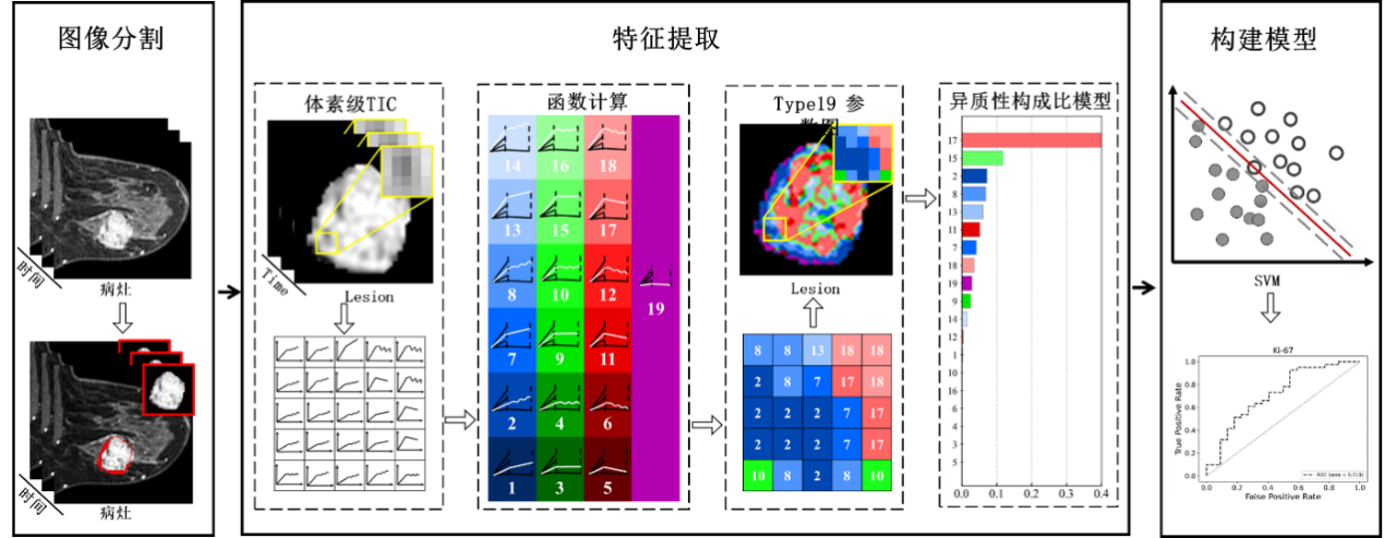 研究团队201812月至20227月,回顾性纳入了259名接受乳腺动态增强磁共振成像(DCE-MRI)检查的患者,共325个病理学证实的乳腺病变。基于手动分割的乳腺病变,将整个3D病变内每个体素的时间-信号曲线根据初始强化速率(未强化、缓慢、中等和快速)、延迟强化状态(持续、平台和下降)和强化稳定性(稳定和不稳定)分为19类,并计算每个病变的这19TIC曲线的组成比作为新的特征集(定义为type-19)。分别type-19特征、临床常用的三TIC(流入型、平台型和流出型)以及半定量参数构建机器学习模型,用于鉴别病变的良恶性、病理分级、增殖状态(Ki-67)和分子亚型(详见技术路线图1)。
