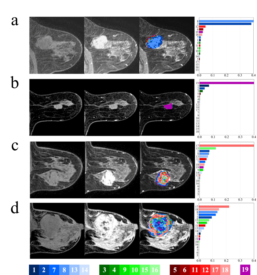 针对上述问题,该研究绕开复杂的生理学模型,提出一种不基于模型、纯数据驱动的DCE图像定量分析方法,顺利获得体素提取时间信号曲线进行自动分类,并不同类别时间信号曲线的空间分布和分类占比映射到肿瘤空间内部进行颜色编码,实现了对乳腺癌血流动力学异质性定量可视化评估。研究发现该新方法所提取的血动力学异质性特征对于区分乳腺肿瘤的良恶性、病理级别、分子亚型和细胞增殖状态有显著的价值,为研究肿瘤微环境异质性给予了一种新思路和新方法。