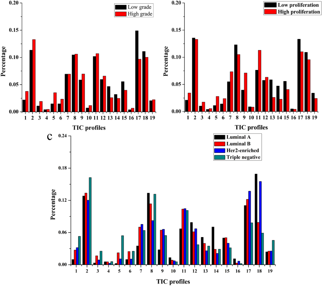 图4 高级别和低级别(a),高增殖和低增殖状态(b)以及四种分子亚型浸润性乳腺癌(c)的Type-19特征的比较条形图