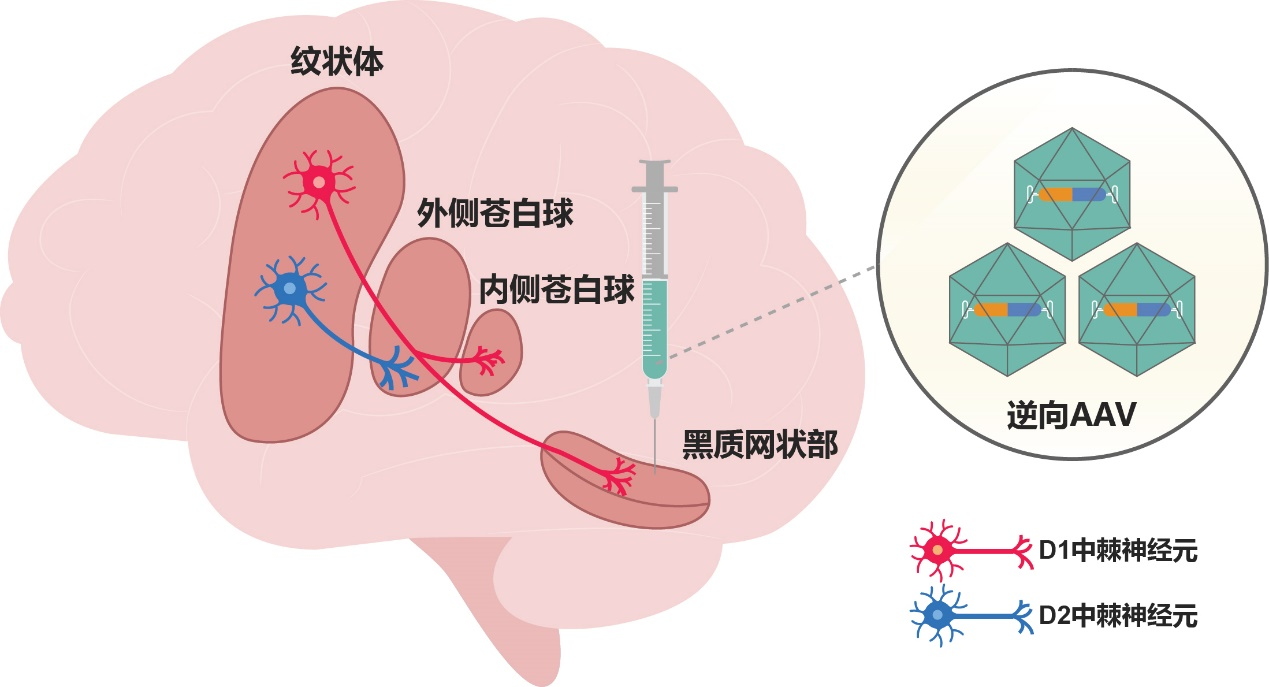 过往基于啮齿类动物模型的研究发现,只要特异性逆转D1中棘神经元的活动抑制,就可以起到治疗帕金森病运动症状的功效;但实现这一靶向调控需要使用经过遗传改造的,在D1中棘神经元中表达外源蛋白元件的转基因动物,这是在灵长类大脑特别是人脑中完全无法实施的技术策略。研究团队顺利获得对这一技术瓶颈进行系统分析发现,如果想要在纹状体脑区中做到对直接通路的D1中棘神经元进行干预而不影响同一脑区中的间接通路D2中棘神经元(在运动控制中起到类似“刹车”的作用),可以利用这两类神经元的神经环路结构差异:即只有D1中棘神经元的轴突投射至远离纹状体的黑质网状部脑区,而D2中棘神经元的轴突投射至紧邻纹状体的外侧苍白球脑区。