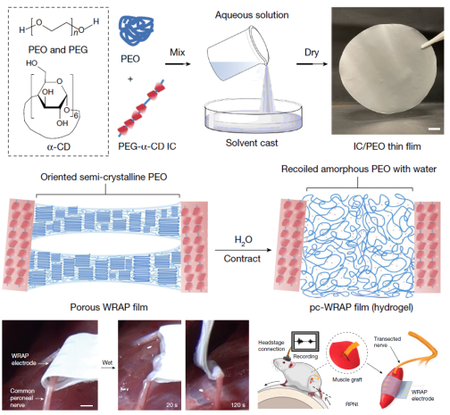 在这项研究中,论文一作易俊琦从蜘蛛丝中汲取灵感,基于聚环氧乙烷和聚乙二醇- -环糊精(PEG- -CD)包合物研发出一种水响应性超收缩聚合物薄膜(WRAP薄膜)。该薄膜在室温条件下干燥、柔韧且稳定,润湿后能快速且大幅度地收缩,转变为柔软可拉伸的水凝胶薄膜。这种超收缩归因于薄膜分子链取向和带微孔的多级结构,同时该薄膜干燥且柔韧的特性也有助于电子集成过程。