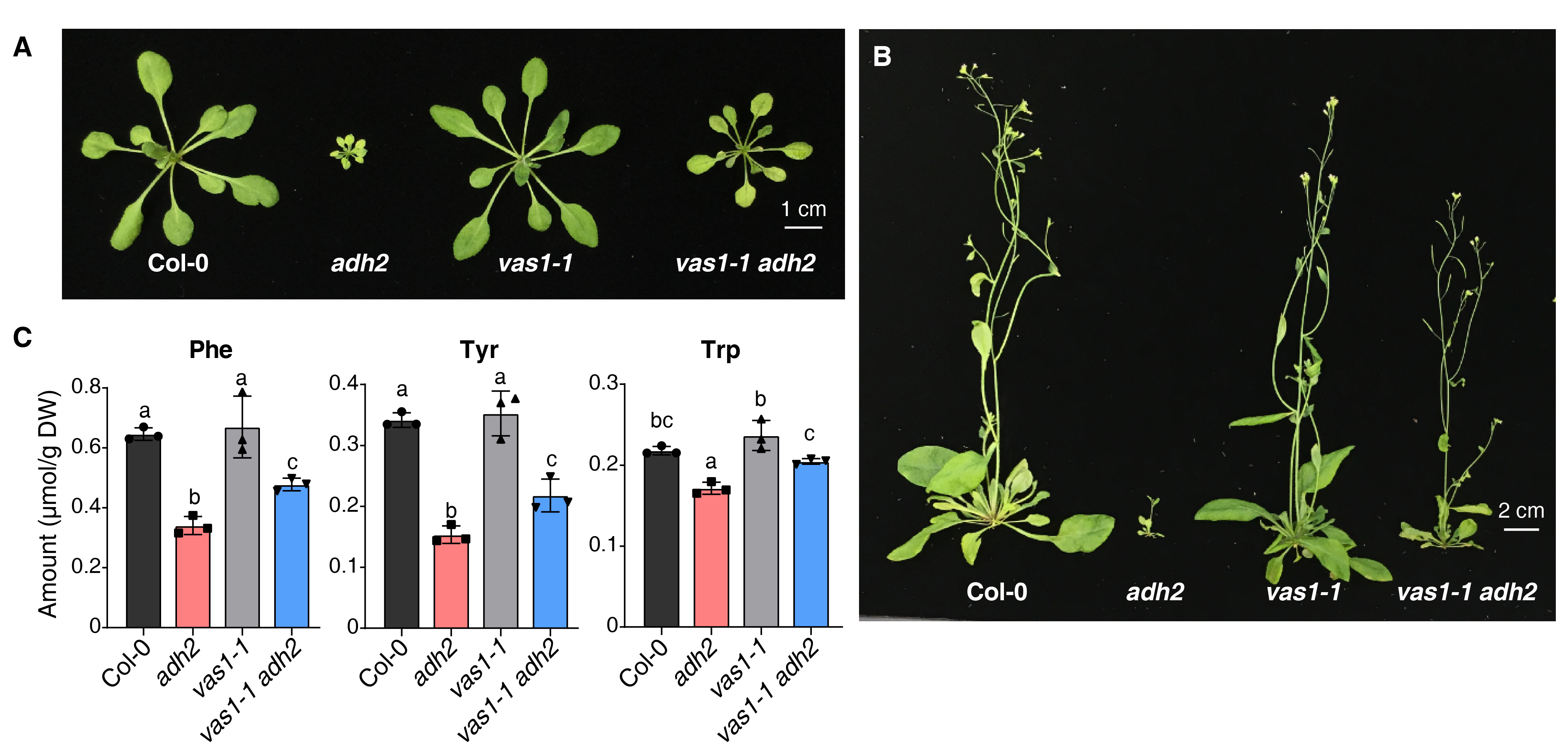 基于以上背景,赵乔团队利用一个拟南芥芳香族氨基酸合成降低的突变体进行正向遗传学的筛选,得到了多个该突变体的表型恢复植株。进一步顺利获得测序得到基因信息,发现多个可能参与拟南芥芳香族氨基酸合成、代谢及调控的基因。研究团队对其中一个基因进行分析析。该基因编码氨基转移酶VAS1(REVERSAL OF SAV3 PHENOTYPE 1VAS1 adh2 中的功能缺失突变部分恢复了adh2 的植物表型以及芳香族氨基酸合成下降的性状(图1),说明VAS1需要消耗氨基酸