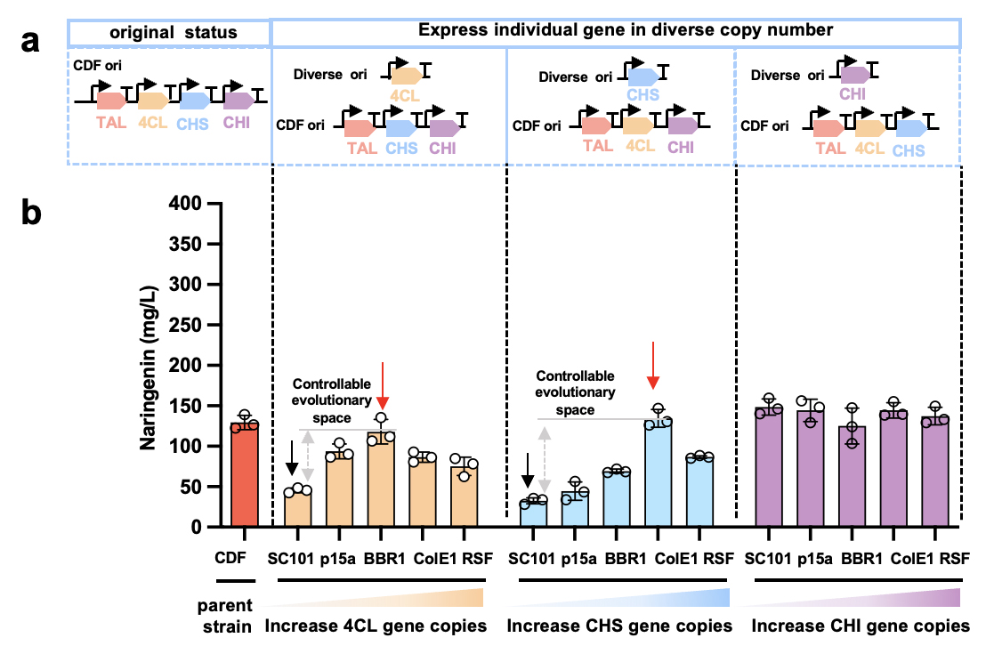 改变外部环境可重塑途径进化适应度特性,解决代谢途径进化陷入局部最优解的困局。因此,研究团队逐个降低各关键基因表达水平,进而改变代谢途径关键性基因进化的适应性。为了达成同步自动化辅助酶进化,研究团队还进行了如下设计:1)仅用终产物柚皮素响应的分子探针系统作为评估途径代谢能力的标准,以实现统一的筛选方法;2)搭载自动化大设施平台技术,在清晰进化轨迹内实现各基因同步、迭代进化。